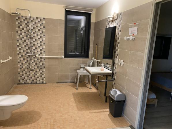 Douche à l'italienne avec barre de maintien, chaise adaptée PMR